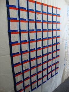 I’m going to quilt it by hand using the big stitch method. I got blue and white variegated thread, so that should look nice as it weaves through three different colors of blue and orange. Now I just have a little less than six months to finish it before our one-year anniversary.