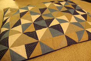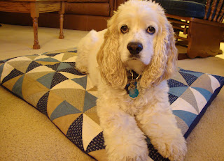 I used a charm pack to create pinwheels, sewed a pillow case back and stuffed it with a waterproof dog bed liner filled with cedar chip pet bedding. Not only is it comfy, but cedar is a natural flea and bug repellent.