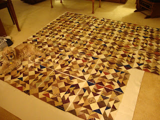 I’ve been working on a scrap quilt made in creams and browns. As I finished the last of the 25 squares last night, my dog, Lady, thought she’d test it out.
