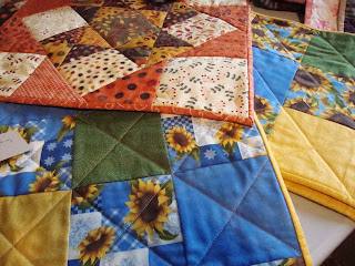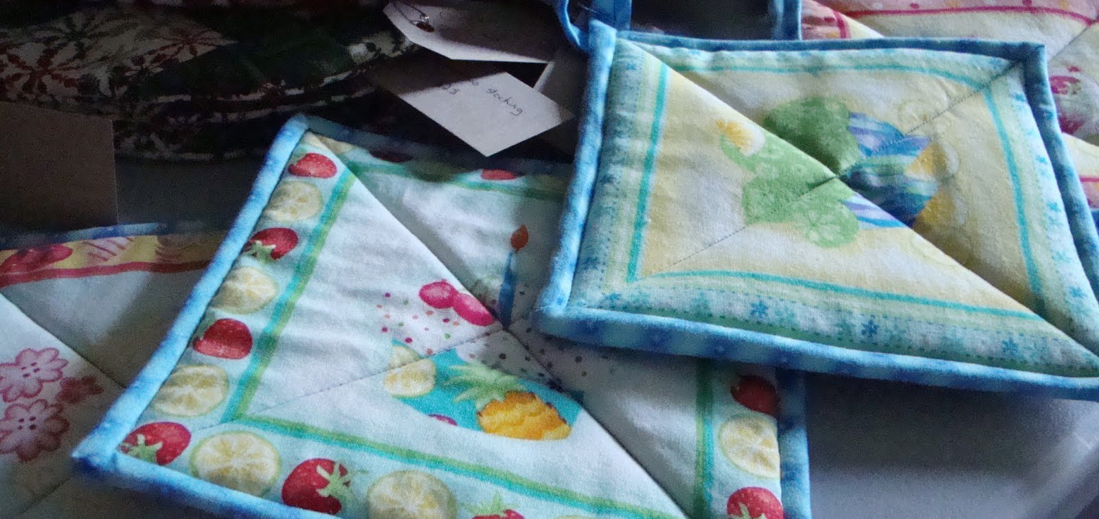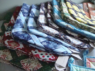 I’ve made table runners, table toppers, pot holders, Christmas stockings, a messenger bag, baby/lap quilts and matching doll quilts. I’m still finishing up a few items, but I’ll have close to 50 available on the day of the fair and all but three are priced between $5 and $30.