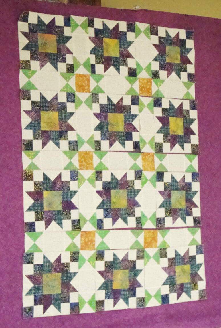Now there’s a background fabric to simulate setting triangles because the blocks have been set on point. I love the alternating block Pat came up with. This setting is my favorite.